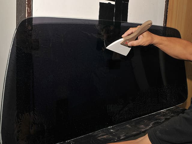 フィルムをガラスの形状に合わせカットし、ガラスに貼りつけます。